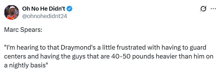 名记斯皮尔斯在今天的节目中表示:“我听说,格林对于每晚都得去防守中锋,对抗那些比自己重了足足四五十磅的球员,心里已经有些不爽了。”