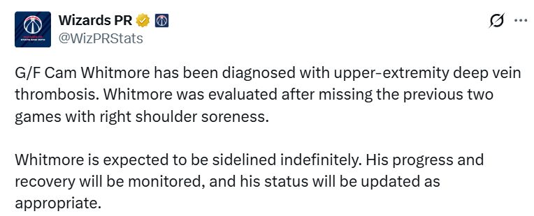 自12月5日以来,惠特莫尔便未再登场,缺席了奇才队过去的六场比赛。他先是连续四场被列为“教练决定不出战”,后两场则因右肩酸痛被加入伤病报告。在对酸痛的肩部进一步检查后,确诊了血栓症状。