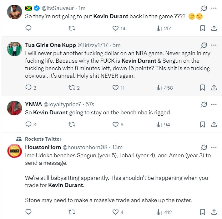 火箭球迷纷纷对乌度卡的用人表示不理解:杜兰特第四节竟然一分钟都不打?乌度卡在做什么?
