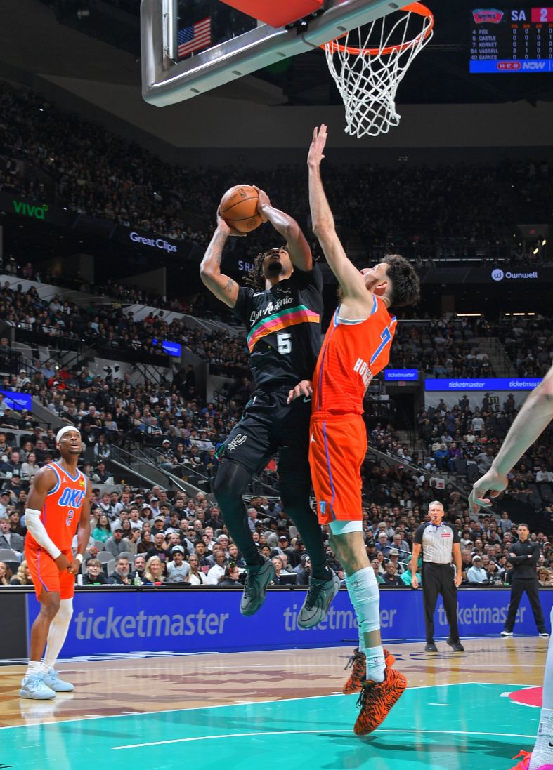 两队拼防守拼的很厉害,文班亚马在场上都没有太多的机会,上半场文班亚马只拿到7分,SGA在第二节是大爆发8中5拿到11分1篮板2助攻,半场打完SGA拿到16分,马刺这边则是多点开花,卡斯尔、瓦塞尔、巴恩斯、凯尔登发挥都比文班亚马还好。