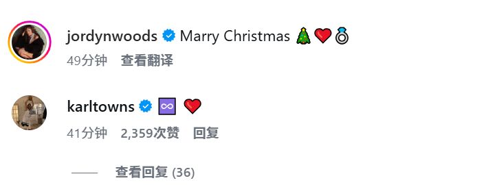 唐斯和女友伍兹在Instagram上宣布订婚,他们发布了一系列照片,并用谐音梗来配文"MarryChristmas"。这对情侣在近日订婚之前已经交往了五年。