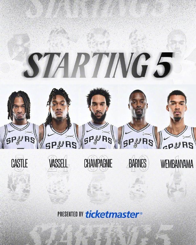 马刺:尚帕尼、巴恩斯、文班亚马、瓦塞尔、卡斯尔