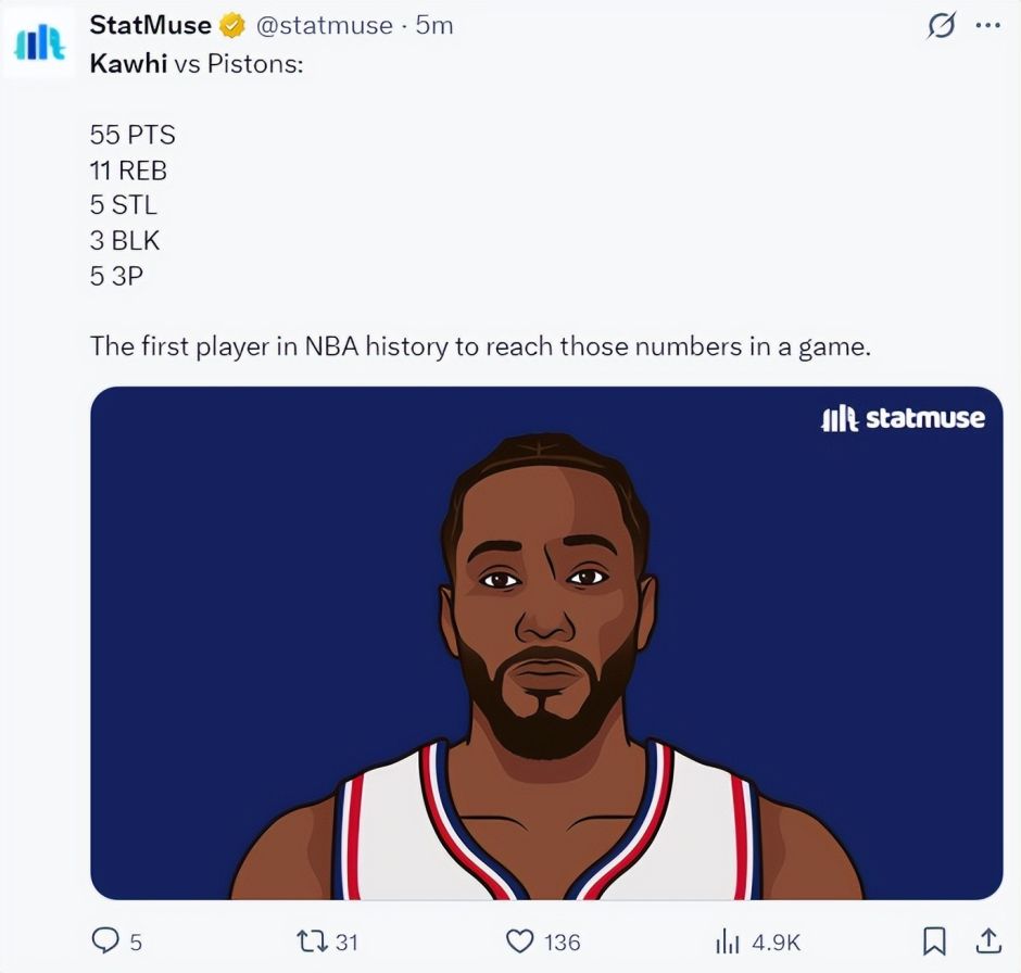 这场比赛后小卡也登上了全美热搜,他拿到55+的数据对于已经34岁的他来说是逆天一战了,因为巅峰28-32岁的他都没做到。