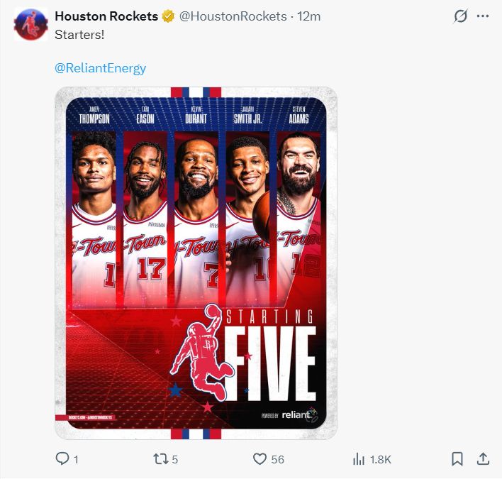 火箭:阿门、杜兰特、伊森、史密斯、亚当斯;