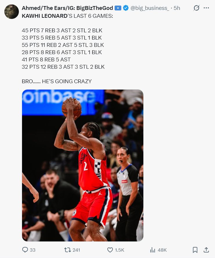快船赢球的第一功臣肯定是伦纳德,他已经被球迷们誉为战神卡,此役他在末节14中8+三分8中4,拿到20分1篮板3助攻1抢断炸裂无比,全场比赛39分钟,29中16,三分16中6,罚球9中7,拿到45分7篮板3助攻2抢断2盖帽,命中率55.2%,三分命中率37.5%。