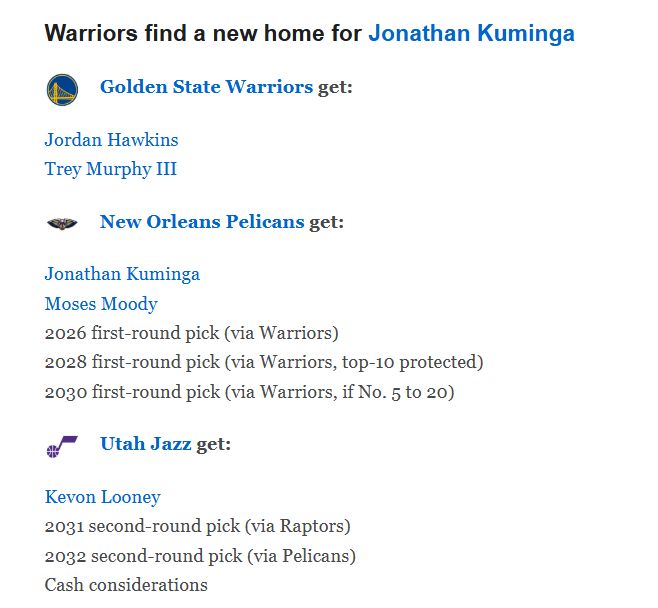 鹈鹕队得到:库明加、穆迪、2026年首轮签、2028年首轮签、2030年首轮签
