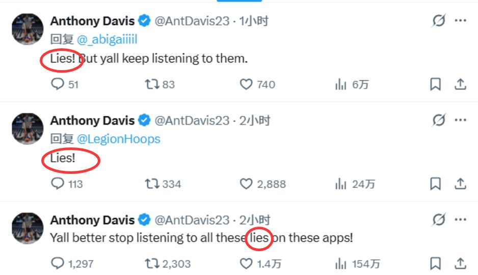 戴维斯对Shams的报道予以否认,并通过社交媒体进行反驳。“大家最好别再相信这些平台上的谎言了。”戴维斯在社媒上写道,随后又在多条援引这一突发新闻的帖子下回复“谎言”二字。